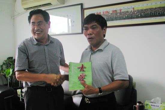 钟秘书长为顺德扶贫开发协会会长周添雄(右)送上《大爱》