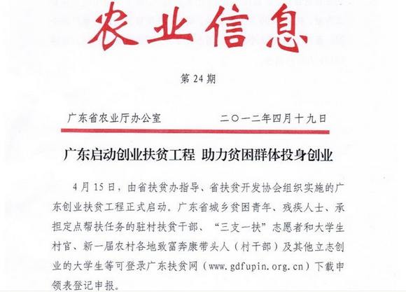 4月19日,省农业厅办公室《农业信息》第24期以《广东启动创业扶贫工程,助力贫困群体投身创业》为标题,对我会创业扶贫工程的实施(受益)对象、实施途径、实施步骤及目标任务等方面内容做了专题介绍。