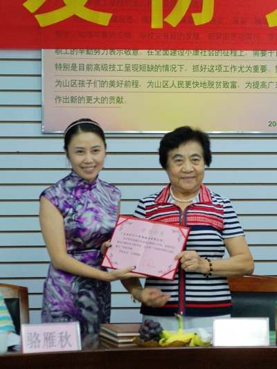 协会主席吴桂贤向扶贫形象大使周洁(左一)颁发聘书(左图)