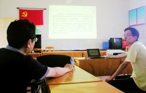 驻村干部朱凤贤博士向钟秘书长PPT展示省府扶贫“双到”的亮点工作。