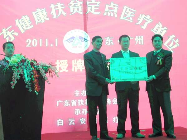 本网讯 2011年的第一天,明媚的阳光普照羊城大地,今日的广州嘉禾小镇分外和煦温馨。满怀健康扶贫公益事业的新年期许与展望,广东省健康扶贫定点医疗单位今日上午在白云区安康门诊部正式授牌成立。广东省扶贫开发协会秘书长钟韶彬出席授牌仪式并作重要讲话,广东省扶贫开发协会健康扶贫办公室副主任、广东省卫生厅原医政处处长翟祖唐宣读广东健康扶贫定点医疗单位批复文件。