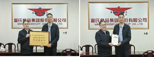 钟韶彬(左)向温氏集团赠送牌匾和图书