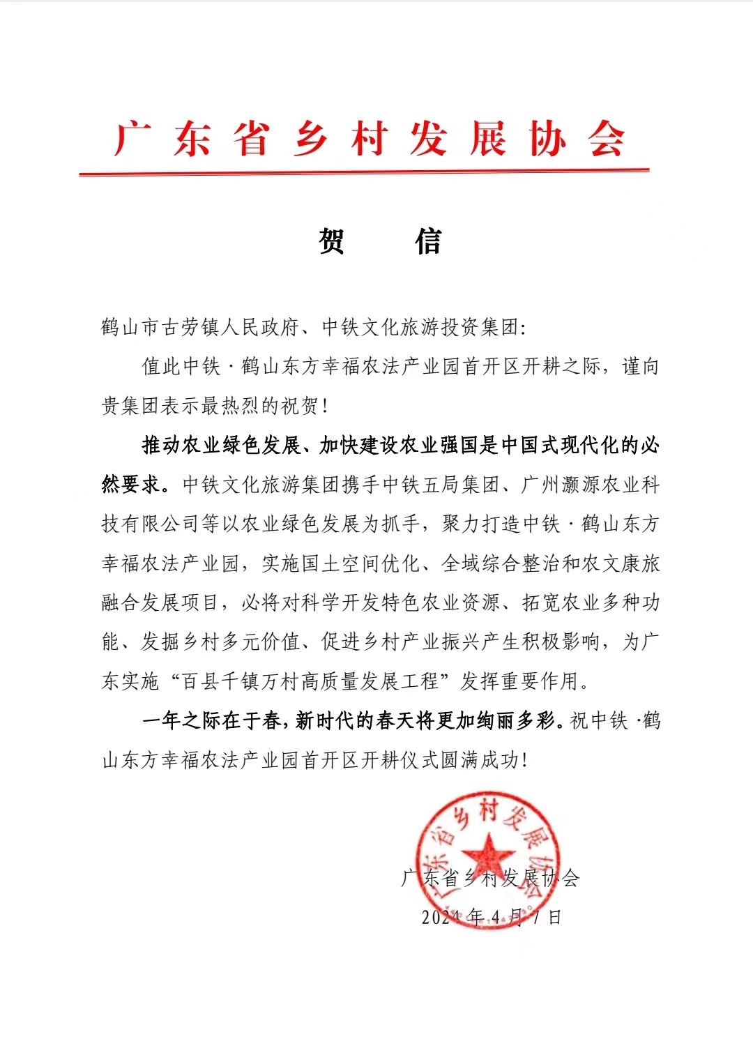 值此中铁·鹤山东方幸福农法产业园首开区开耕之际,谨向贵集团表示最热烈的祝贺!