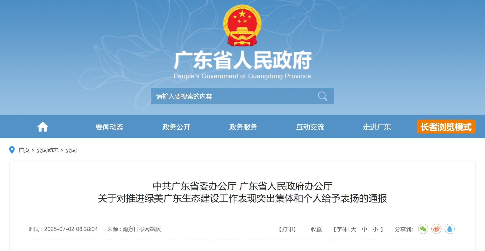 近日,中共广东省委办公厅、省政府办公厅印发通报,表彰在推进绿美广东生态建设工作中表现突出的集体和个人。
