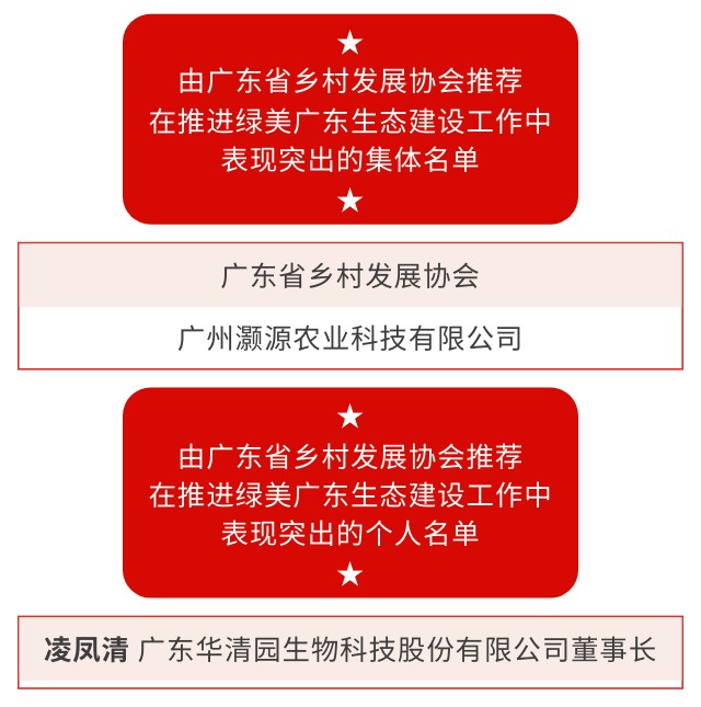 通报指出,为进一步激发全省上下推进绿美广东生态建设的工作热情,经省委、省政府同意,印发《关于对推进绿美广东生态建设工作表现突出集体和个人给予表扬的通报》,对在推进绿美广东生态建设工作中表现突出的200个集体和200人给予通报表扬。其中,广东省乡村发展协会及其推荐的广州灏源农业科技有限公司获“在推进绿美广东生态建设工作中表现突出集体”通报表扬,广东华清园生物科技股份有限公司董事长凌凤清获“在推进绿美广东生态建设工作中表现突出个人”通报表扬。