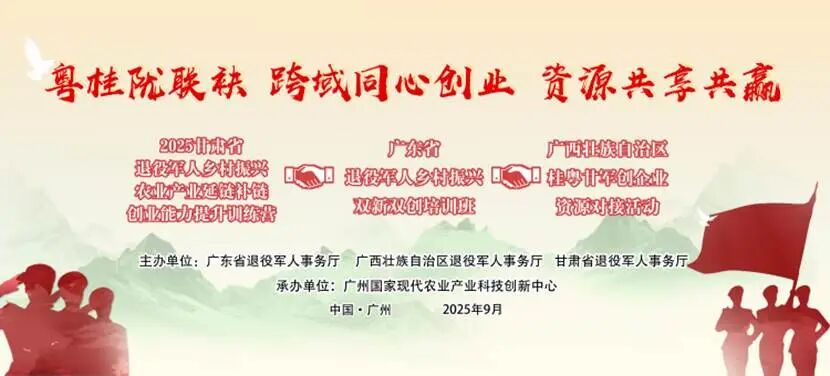 2025年9月15-19日,由广东省退役军人事务厅、广西壮族自治区退役军人事务厅、甘肃省退役军人事务厅共同举办的2025年粤桂甘退役军人乡村振兴“双新双创”联合培训班在穗开班。广东省政府参事、省乡村发展协会理事长钟韶彬应邀为其作首场专题授课,首推退役军人乡村振兴“双新双创”四有五新六链七合八力法。