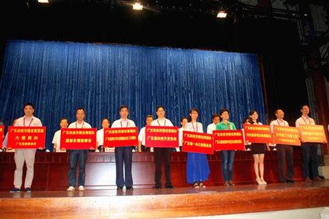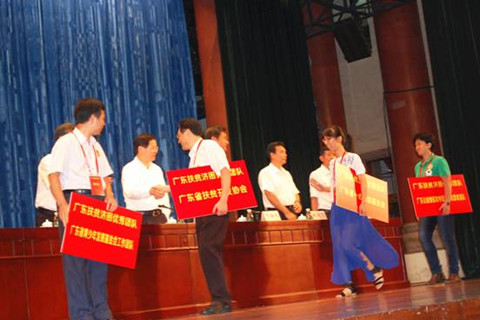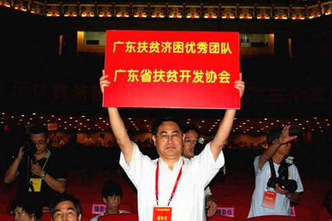 常务副理事长兼秘书长钟韶彬(前排左四)代表“2013年度广东扶贫济困优秀团队”广东省扶贫开发协会上台举牌
