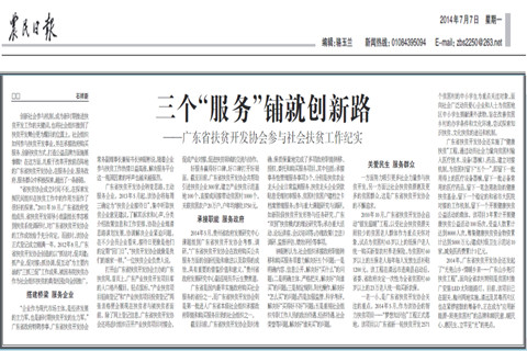 本网讯(通讯员 朱迪婧报道) 7月7日,《农民日报》第三版要闻刊登《三个“服务”铺就创新路:广东省扶贫开发协会参与社会扶贫工作纪实》一文,重点介绍了广东省扶贫开发协会近年来在创新扶贫服务方式方面收获的经验和取得的成效。该文一经刊登即被中国农业新闻网、凤凰网等重要媒体转载。