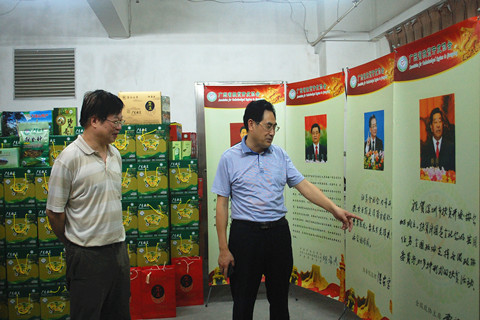 钟韶彬副理事长在展厅向黎建波副局长(左)介绍协会工作成果