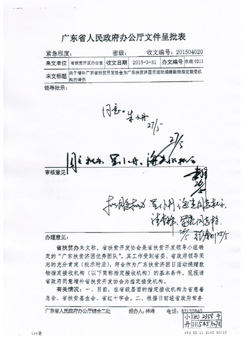 为广东省扶贫开发发协会正式进入广东扶贫济困日活动捐赠受赠人行列,省扶贫开发办公室专此向省政府提出请示,指出:省扶贫开发协会是省扶贫开发领导小组确定的“广东扶贫济困优秀团队”,其工作受到省委、省政府领导同志的充分肯定,符合作为广东扶贫济困日活动捐赠款物接收机构的基本条件。省政府办公厅在征求民政、财政、法制、编办、审计等省直部门意见的基础上,提出建议:适当增加广东扶贫济困日活动捐赠物资指定接受机构有利于扩大社会参与,拓宽募集渠道。鉴于省扶贫开发协会在扶贫开发方面具有良好工作基础,确定其为广东扶贫济困日活动捐赠款物指定接受机构。