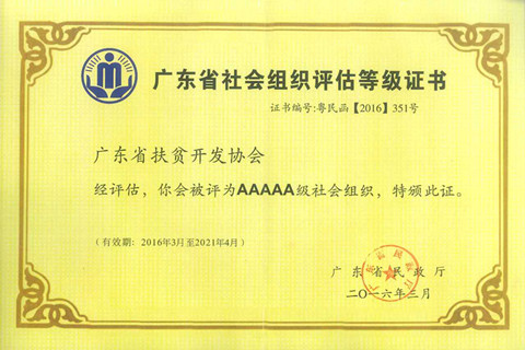 据悉,5A级社会组织是我国社会组织等级评估体系中的最高等级,将在年检、政府采购服务等环节获得便利或优先。省人民政府特聘参事、协会常务副理事长兼秘书长钟韶彬从王长胜副厅长手中接过5A级社会组织牌匾和证书后,表示, 广东省扶贫开发协会成为最高等级的社会组织,是对协会多年工作的肯定。协会将以此为新的起点,锐意进取,积极作为,勇当全省乃至全国社会组织的先锋模范,为全省全国精准扶贫、精准脱贫做出新的更大的贡献。