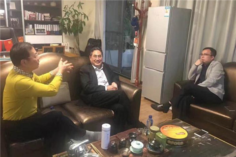 广东省人民政府特聘参事、广东省扶贫开发协会常务副理事长兼秘书长钟韶彬(中)与碧桂园集团副总裁朱剑敏(右一)、助理总裁兼社会责任事业部总经理罗劲荣(左一)就精准扶贫项目落地进行深入探讨