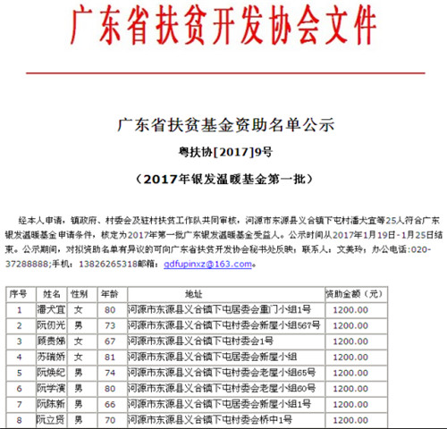 2017年1月19日-25日,广东省扶贫开发协会对2017年第一批广东银发温暖工程基金受益人名单进行了网络公示。