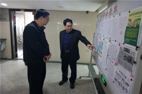 省政府特聘参事、省扶贫开发协会常务副理事长兼秘书长钟韶彬同志带领天河区员村街驻兴宁市石马镇向前村扶贫工作队柯建国队长参观协会公告栏。