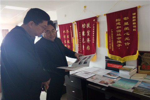 省政府特聘参事、省扶贫开发协会常务副理事长兼秘书长钟韶彬同志带领天河区员村街驻兴宁市石马镇向前村扶贫工作队柯建国队长参观扶贫文化室。