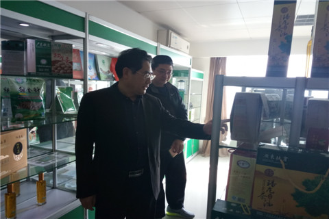 省政府特聘参事、省扶贫开发协会常务副理事长兼秘书长钟韶彬同志带领天河区员村街驻兴宁市石马镇向前村扶贫工作队柯建国队长参观扶贫农产品展室。