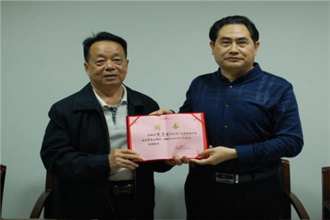 省政府特聘参事、省扶贫开发协会常务副理事长兼秘书长钟韶彬(右)为协会党支部原书记黄乔国(左)颁发协会党务顾问聘书。