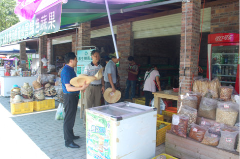 省政府特聘参事、省扶贫开发协会常务副理事长兼秘书长钟韶彬与省委办公厅副巡视员韦龙同志实地查看农产品营销情况