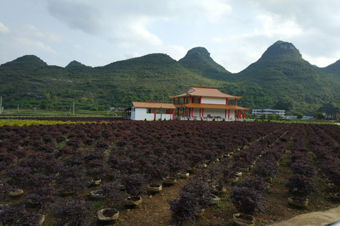 一进村子,近300亩的苗木场便在我们眼前铺展开来。被山岭环绕着的苗木场里,桂花、红继木、金边连翘等十多种苗木,郁郁葱葱,长势喜人。灌木苗木的另一边,是由恒茂公司统一经营管理的示范基地,六七十个村民正顶着烈日,在技术员韦师傅的指导下忙碌着栽种地被植物毛杜鹃。汗水从他们的脸颊淌下,但从那脸上洋溢的笑容里,我们不难看出,他们对未来生活的无限憧憬:碧桂园为央律村选准了产业,也是为他们铺就了一条“绿色”致富路。