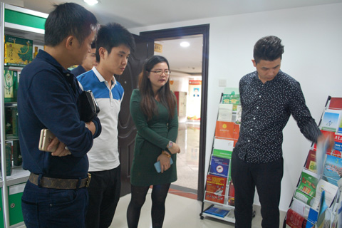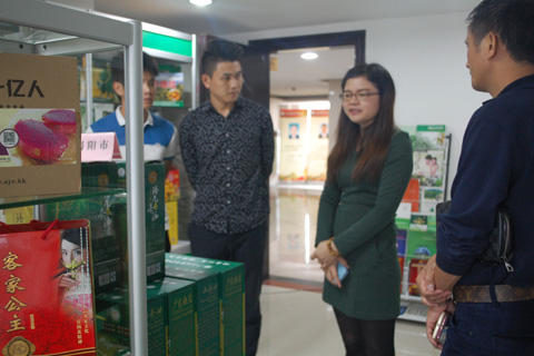 省扶贫开发协会秘书长助理文美玲同志向陈新华董事长一行参观协会农产品展览室