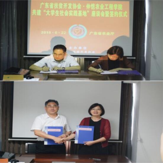 《广东扶贫》全媒体中心讯(通讯员/李杰报道)6月22日下午,广东省扶贫开发协会与仲恺农业工程学院共建大学生社会实践(实习)基地续约签字仪式在广东省农业厅举行。广东省人民政府特聘参事、省扶贫开发协会常务副理事长兼秘书长钟韶彬和仲恺农业工程学院人文与社会科学学院院长曾秀兰分别代表双方在协议书上签字。
