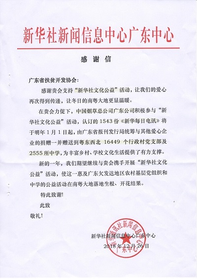 (图为新华社新闻信息中心广东中心的感谢信)