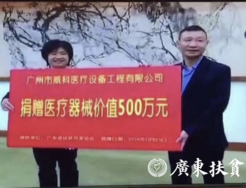 近日,由广东省扶贫开发协会主办的广东健康扶贫物资首场地市捐赠在云浮举行。广东省扶贫开发协会副理事长单位、广州市威科医疗设备工程有限公司向云浮市基层医疗卫生单位捐赠价值500万元医疗器械一批。云浮市政协主席黄达辉、云浮市副市长何婧、原广东省卫生厅厅长廖新波出席仪式。广东省人民政府参事室特约研究员、省扶贫开发协会常务副理事长兼秘书长钟韶彬主持捐赠仪式。