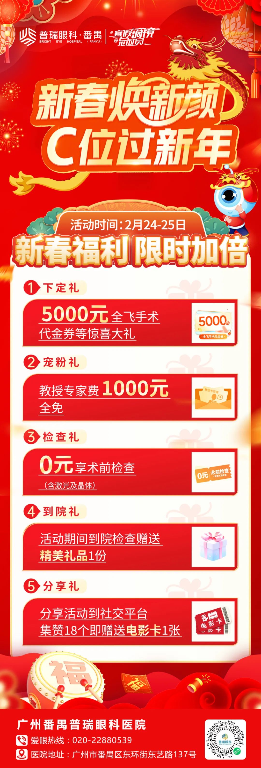 这个春节,近视的你想必也遇到过这些不便和烦恼——与亲友打火锅,未开吃,眼镜先起了雾与兄弟打球,眼镜总是不可避免掉落在地和姐妹逛街,纠结戴隐形眼镜还是框架眼镜……如果你戴眼镜的烦恼很多摘镜的想法又很强烈那么,请你来参加这次摘镜活动龙年摘镜·行大运番禺普瑞眼科2月24~25日将延续春节福利并加码5000元全飞手术代金券等惊喜下定礼更多新春摘镜福利等你来拿! 普瑞眼科自2005年成立至今已经19年是一家已经IPO上市的眼科医疗机构番禺普瑞眼科作为其中之一设有屈光手术科、白内障专科等六大科室 其中,屈光手术科目前由刘泉教授、李敏超副院长领衔科室可开展全飞秒手术、半飞秒手术、远视手术、ICL晶体植入术等术式刘泉教授普瑞眼科副总院长从医30多年,临床经验丰富擅长屈光手术完整解决方案