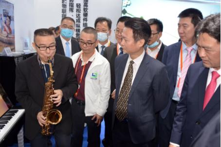 开幕式结束后,湛江市政府副市长欧先伟、廉江市委书记林海武等与会领导、嘉宾莅临龙健集团展厅,参观龙健的高科技智慧音视频、乐器等展览产品。最近荣获湛江市第四届市长杯工业设计大赛暨第十届省长杯工业设计大赛湛江赛区获得产品组最高奖项也是唯一的一个一等奖的龙健折叠钢琴,与龙健奥德曼钢琴、FInd智慧钢琴等共同亮相,获得领导嘉宾的高度评价及广大客商、观众的青睐。龙健乐器技术总监梁勇现场用手机连接FInd智慧钢琴蓝牙播放伴奏,演奏了世界名曲《化妆舞会》,展示了Flnd智慧钢琴的科技创新、功能强大、引领时尚的突出优势,受到了领导嘉宾的啧啧称赞!