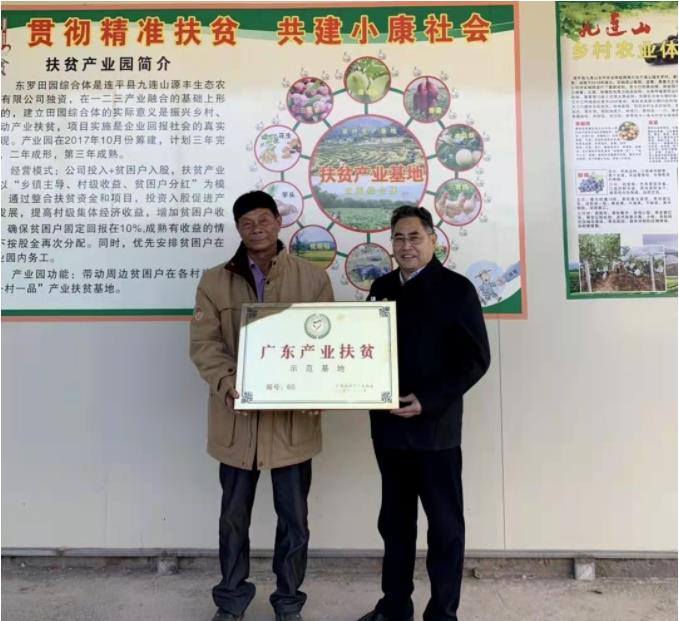 ▲省人民政府参事室特约研究员、省扶贫开发协会常务副理事长兼秘书长钟韶彬与产业帮扶示范基地负责人赖新民合影