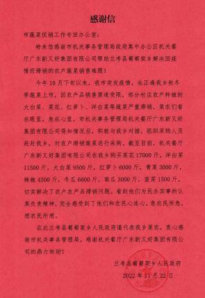 感谢信中说,当下,兰考县葡萄架乡部分村庄农户种植的大白菜、菜花、红萝卜、洋白菜等蔬菜长势喜人、丰收在望。开封市机关事务管理局、广东新又好集团有限公司了解情况后,积极主动对接,组织采购人员对农户蔬菜进行采购。几天里,共购买菜花17000斤,洋白菜11500斤,大白菜9500斤,红萝卜6000斤,青菜3000斤,辣椒4500斤,冬瓜6000斤,南瓜3000斤,菠菜1500斤,切实促进当地农户农产品产销两旺。