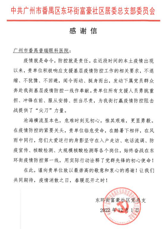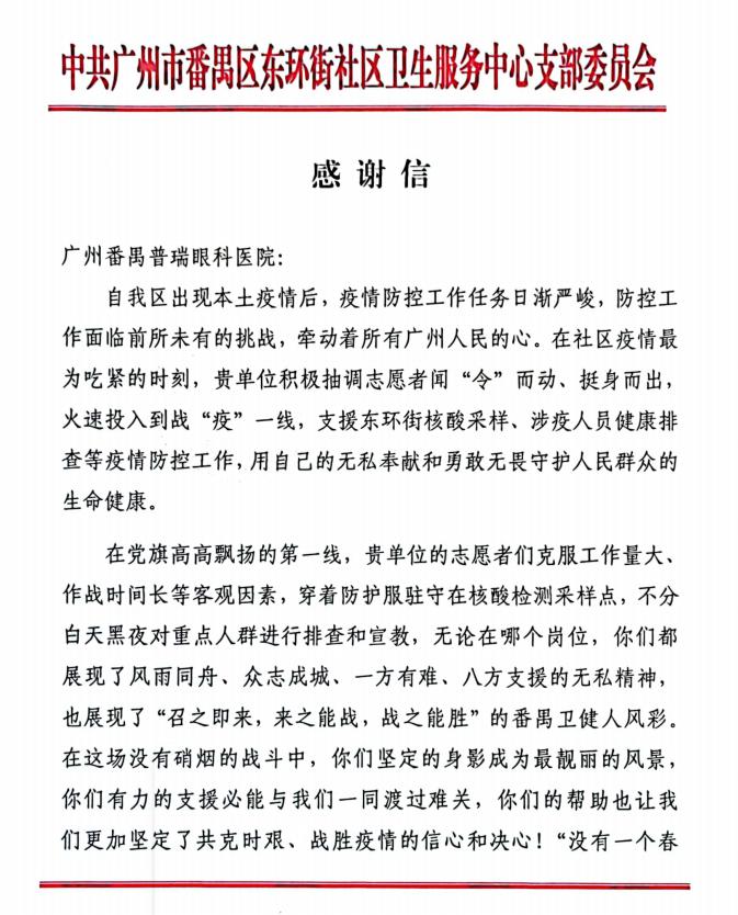 近日,广州番禺普瑞眼科医院(下称“番禺普瑞”)陆续收到番禺区东环街社区卫生服务中心、富豪社区党总支的感谢信,对该院志愿者“闻令而动、挺身而出”投入到抗疫一线表示感谢和高度赞扬。广东省委机关报《南方日报》南方+对番禺普瑞支援抗疫一线的行动进行报道,充分肯定。