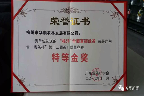本网讯(实习生 曾洁芳报道)11月21日,广东省“粤茶杯”第十二届茶叶质量竞赛结果公布,共61种茶获奖。其中广东省扶贫开发协会理事单位、广东产业扶贫示范基地承办单位——梅州市华顺农林发展有限公司生产的“棉洋”华顺富硒绿茶获得特等金奖。