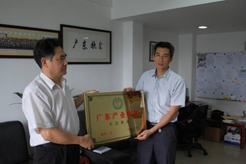 省政府特聘参事、协会副理事长兼秘书长钟韶彬向绿地美公司颁发“广东产业扶贫示范基地”牌匾