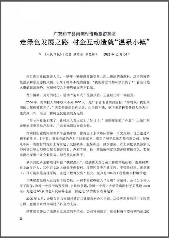 人民日报《广东和平县南湖村借助旅游扶贫走绿色发展之路 村企互动造就“温泉小镇”》