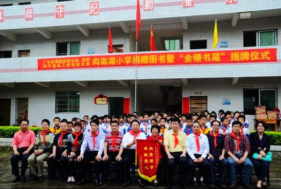 本网讯 2012年4月26日,在协会副理事长、广东金穗集团董事局主席卢和丰先生倡导下,金穗集团党支部、团委,和平温泉之都党团支部组织向河源市和平县南湖村小学捐赠了一批价值3.5万元的图书、电脑等文体用品,并为该校新成立的“金穗书屋”揭牌。广州市协作办领导,和平县热水镇及南湖村相关领导参加了此次活动。