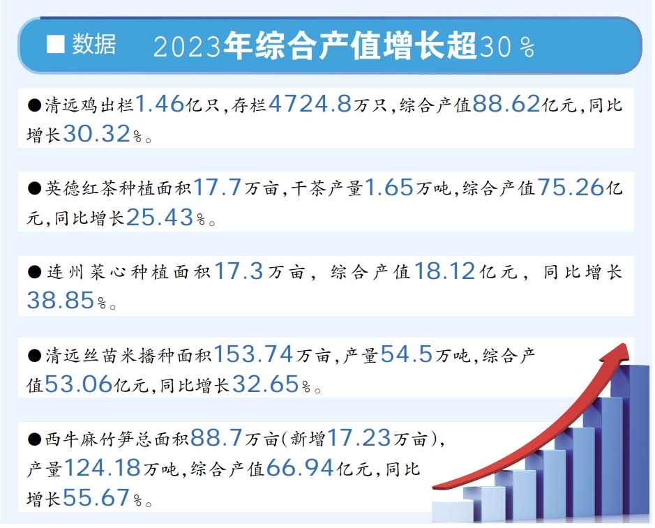 在2023年综合产值增长超30%的良好态势基础上,今年清远市委、市政府明确,力争五大百亿农业产业综合产值增长20%,清远鸡和西牛麻竹笋2个产业突破百亿产值。