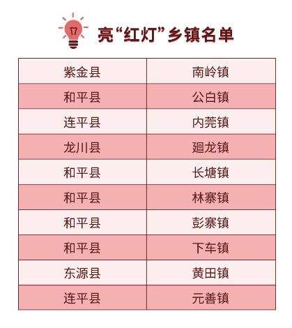 《通报》指出,全市95个乡镇中,源城区源南镇等65个镇亮“绿灯”,连平县溪山镇等20个镇亮“黄灯”,连平县元善镇等10个镇亮“红灯”。对亮“黄灯”和“红灯”的乡镇,责令作出书面说明;对亮“红灯”的乡镇,由县(区)党委分管领导对其主要负责人进行谈话提醒。