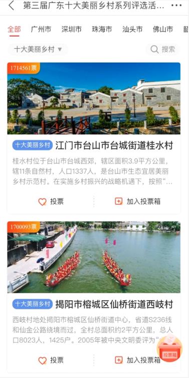 其中,江门市台山市台城街道桂水村在最后时刻以1万张票数实现反超,总票数171万张,成为“广东十大美丽乡村”奖项投票冠军。揭阳市榕城区仙桥街道西岐村以170万张票位居第二,梅州市兴宁市石马镇新群村以141万张票位居第三。
