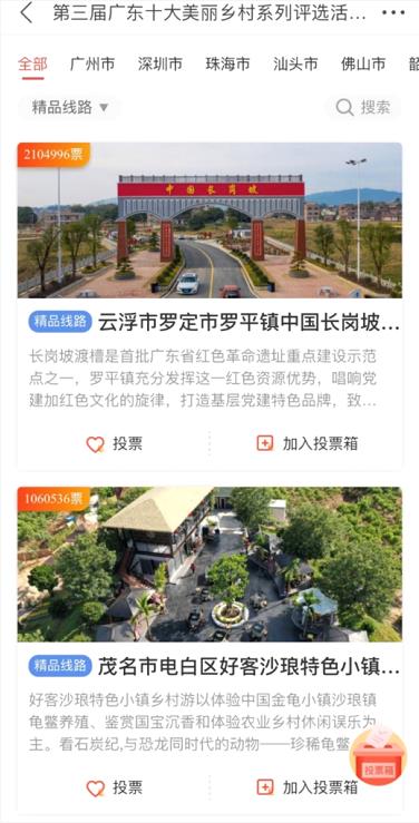 “广东美丽乡村精品线路”共获投票1041万张,其中,云浮市罗定市罗平镇中国长岗坡红色精品旅游线路从80家参评单位中脱颖而出,以210万张票位居榜首,也是网络投票环节的“票王”。茂名市电白区好客沙琅特色小镇精品线路、茂名市茂南区“茂名精彩100里"精品线路分别以106万张以及96万张票数位居第二名和第三名。