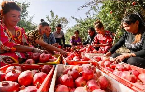 ▲10月1日,新疆和田地区策勒县策勒乡托帕村的村民在采摘石榴。新华社发(许晓龙 摄)