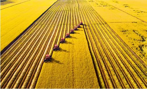 ▲机械化是提升农业综合生产能力的重要措施。作为中国农业现代化的排头兵,黑龙江北大荒集团目前已实现机械化全覆盖,正在积极探索信息化、智能化农业发展的崭新路径。图为2021年8月29日,在北大荒集团江川农场有限公司稻田中,自走式割晒机正进行割晒作业。 人民图片 刘帅冶/摄
