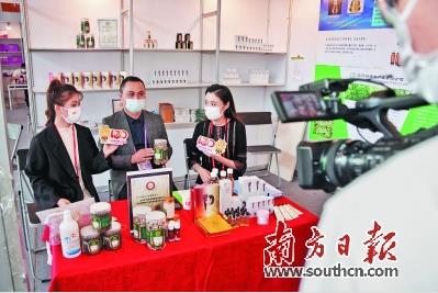 ▲在“乡村振兴特色产品”展区,参展商通过广交会线上直播平台介绍自家产品。南方日报记者 石磊 摄