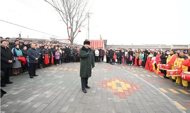 村文化广场上十分热闹,村民们打起威风锣鼓、扭起秧歌欢庆佳节。看到总书记来了,人们高兴地欢呼起来。习近平对乡亲们说,我们党的根本宗旨就是为人民群众办好事,为人民群众幸福生活拼搏、奉献、服务。我们如期打赢了脱贫攻坚战,如期实现了全面建成小康社会目标,现在踏上了全面建设社会主义现代化国家新征程。建设现代化国家离不开农业农村现代化,要继续巩固脱贫攻坚成果,扎实推进乡村振兴,让群众生活更上一层楼,在推进农业农村现代化中越走越有奔头。