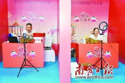 2021中国荔枝产业大会上,各家商户带着自己的荔枝品牌直播带货。石磊 摄