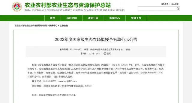 近日,农业农村部农业生态与资源保护总站中国农业生态环境保护协会联合发布《2022年度国家级生态农场拟授予名单公示公告》,全部共计300家,以下为全名单: