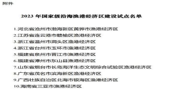 为贯彻落实党中央、国务院关于推进渔港建设的决策部署,按照《农业农村部办公厅、财政部办公厅关于开展国家级沿海渔港经济区建设试点的通知》(农办渔〔20238号,以下简称《通知》)要求,经农业农村部和财政部评审,并以适当形式公示,现对2023年国家级沿海渔港经济区建设试点名单予以公布(名单见附件)。现就有关事项通知如下。
