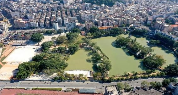 位于高州城区的潘州公园是粤西地区较早建设的公园,建有环湖步道、文化长廊、冼夫人文化景观等设施。图为公园俯视图
