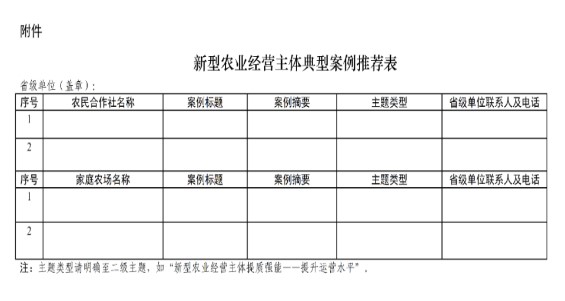 各省级农业农村部门要认真组织开展本地区案例选报工作,根据当地新型农业经营主体发展特点确定案例主题,确保案例文稿质量。各省级农业农村部门对所报送案例内容的真实性负责,每个省份择优推荐农民合作社、家庭农场典型案例各2个,经省级农业农村部门分管领导审定后,于2023年9月28日前连同典型案例推荐汇总表(见附件),一并报送农业农村部农村合作经济指导司。