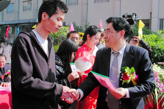 协会钟韶彬秘书长向外来工代表发放健康扶贫卡